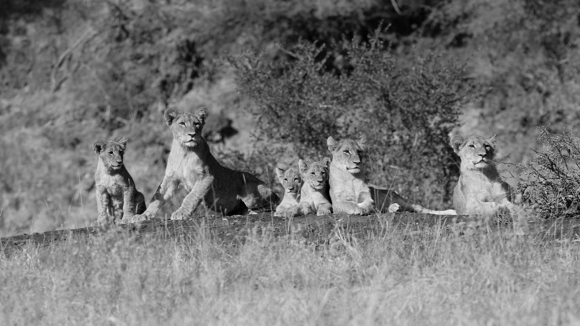 Six cubs, of various ages, united in their journey to become the kings and queens of the savannah.